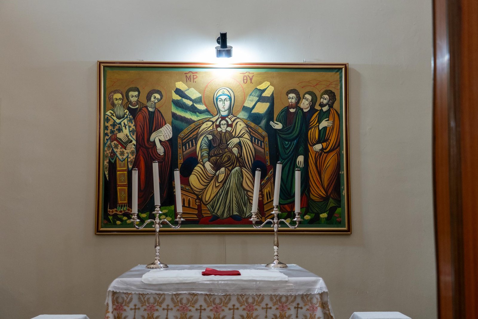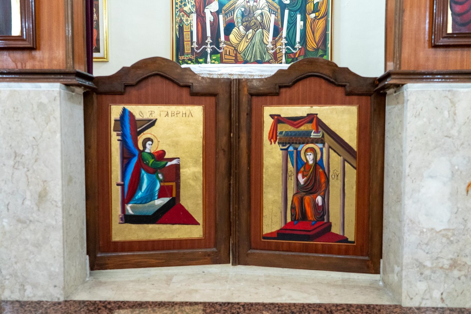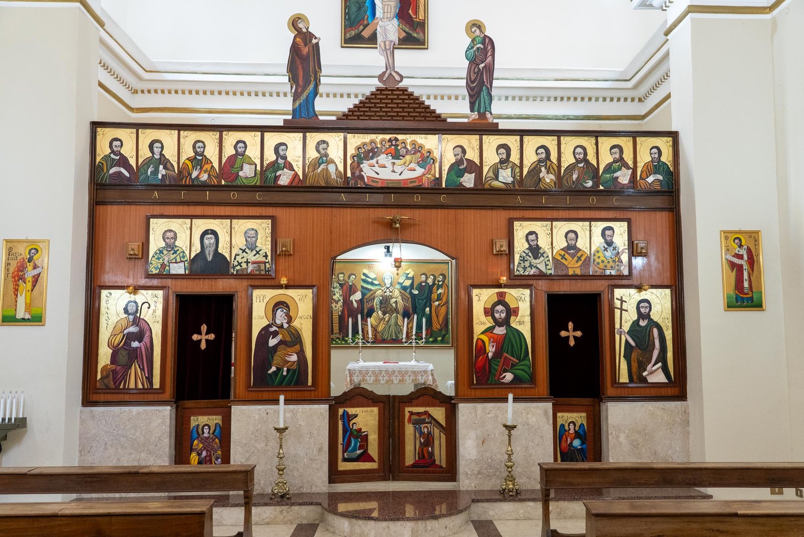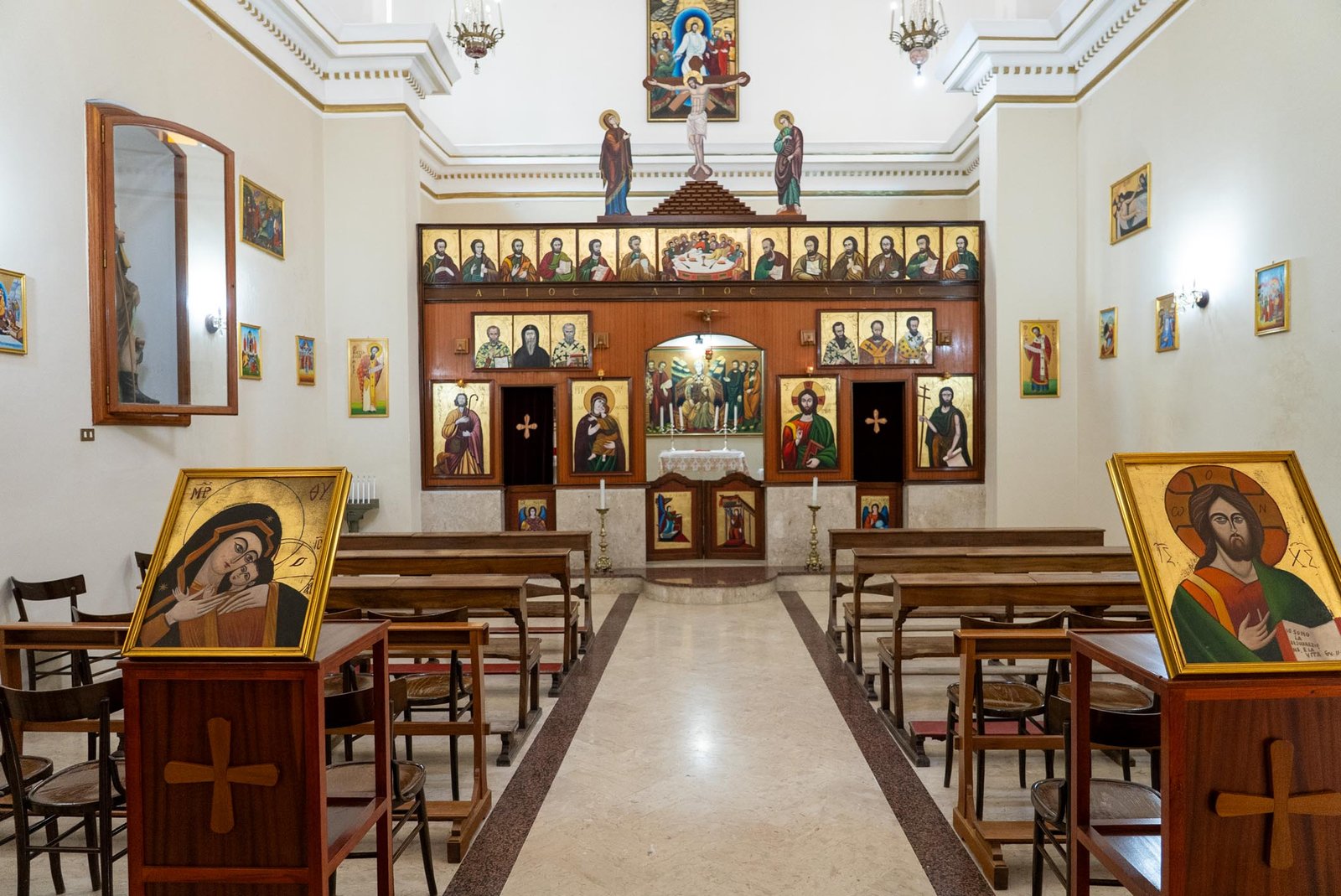 <p>Ma è varcando la soglia che si entra in un luogo che parla la lingua antica della fede bizantina. La chiesa, infatti, è sempre stata officiata secondo il rito greco, una tradizione che ancora oggi affascina per la sua sacralità e per la ricchezza simbolica delle celebrazioni. L’interno presenta una struttura tipica delle chiese di rito orientale: un’unica navata conduce al presbiterio quadrangolare, separato da una splendida iconostasi, vero e proprio diaframma sacro tra il mondo terreno e quello divino. Le pareti, sobrie e intonacate, sono arricchite da un semplice ma raffinato fregio modanato che corre lungo le superfici, accompagnando lo sguardo del visitatore verso l’altare.</p>
